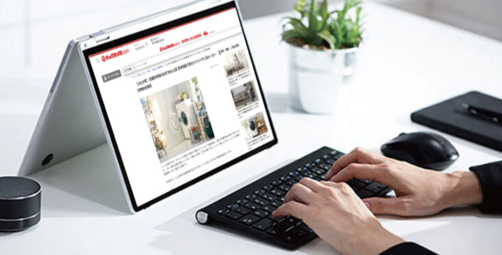 クラムシェル型の一般的なノートPCの多くにはタッチディスプレイ機能が搭載しておらず、急に文字を拡大して記事などを読みたいといったシーンでは、2in1のタッチ式ディスプレイでピンチインによる画面拡大させれたら超便利ですよね。