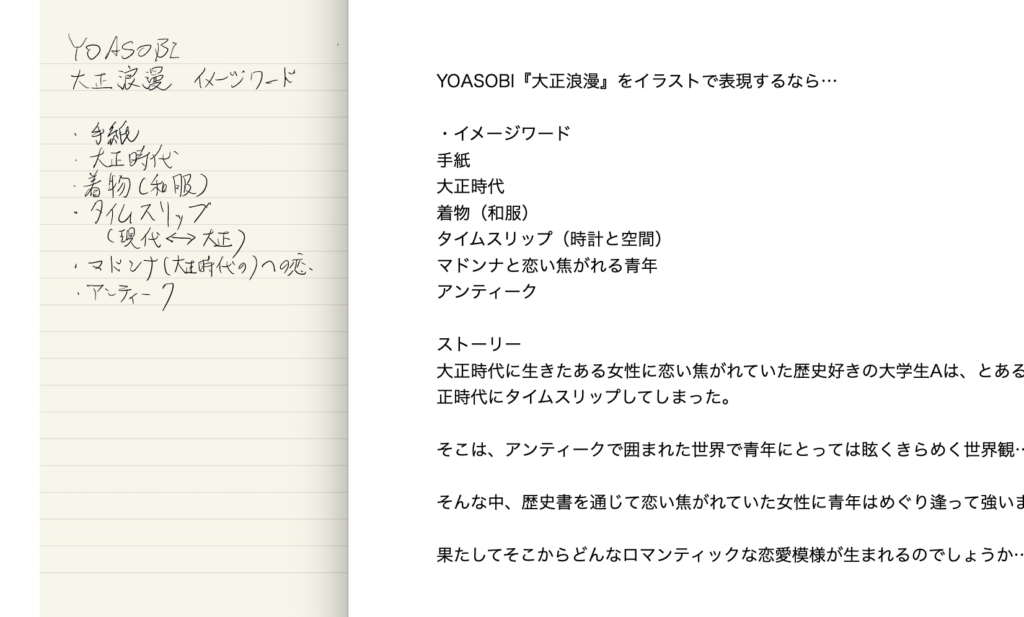 もちろん、YOASOBIの楽曲は名作小説をテーマに描いているので、基本的な世界観は展開されていますが、それとは異なり自分だったら逆に大正浪漫を聴いてどの様な世界観を想像するのか、ふと考え、iPadで気になるワードをメモ書きしてMacBookAirに移して清書化してみました。